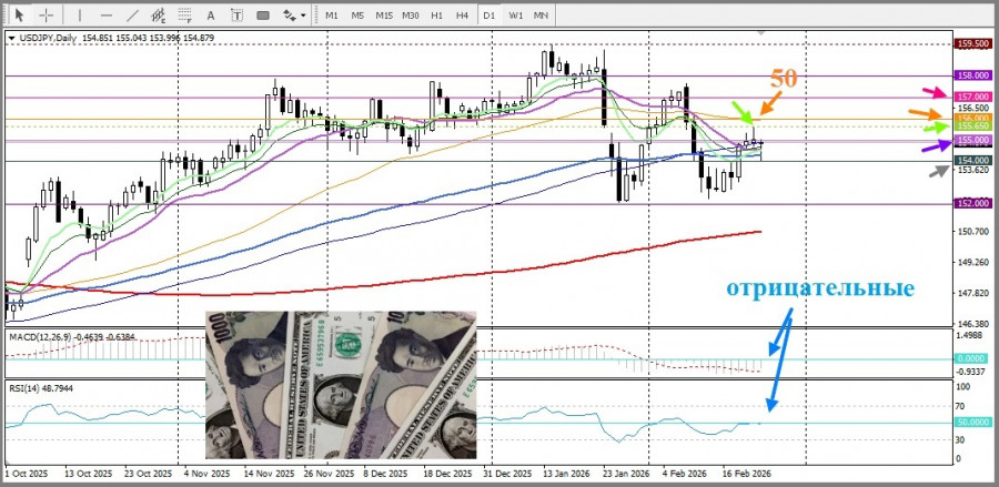 Со стороны японской йены, слабая динамика роста ВВП Японии за четвертый квартал усиливает давление на премьер-министра Санаэ Такаичи, с целью дополнительных стимулов для экономики. Плюс пятничные данные показали снижение ключевого инфляционного индикатора Японии до двухлетнего минимума, что уменьшает вероятность скорого ужесточения монетарной политики Банка Японии. В итоге это ограничивает иену в росте при невысоких объемах торгов после банковских каникул в Японии и создает благоприятную позицию для роста пары USD/JPY, призывая к осторожности перед открытием агрессивных позиций.