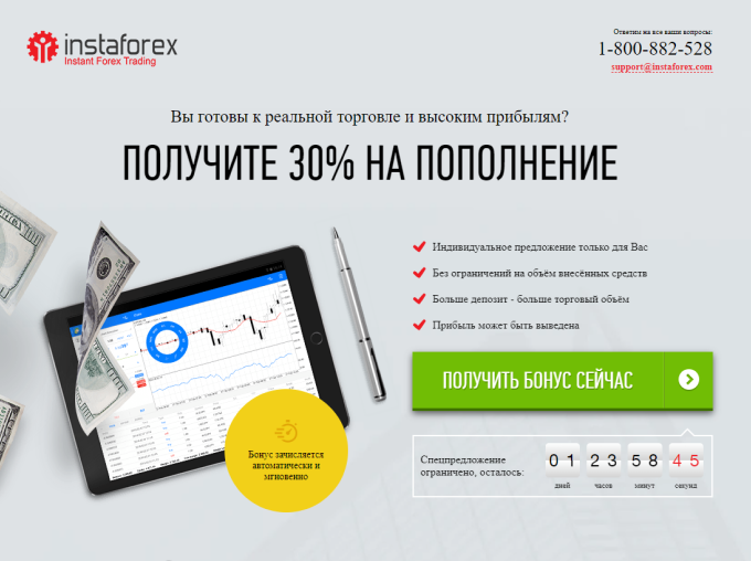 Выгодное предложение только для клиентов ИнстаФорекс. Пополните счет и получите +30% к сумме пополнения. Повышенный депозит даст возможность совершать сделки большего объема. Бонус начисляется моментально на любую сумму без ограничений.