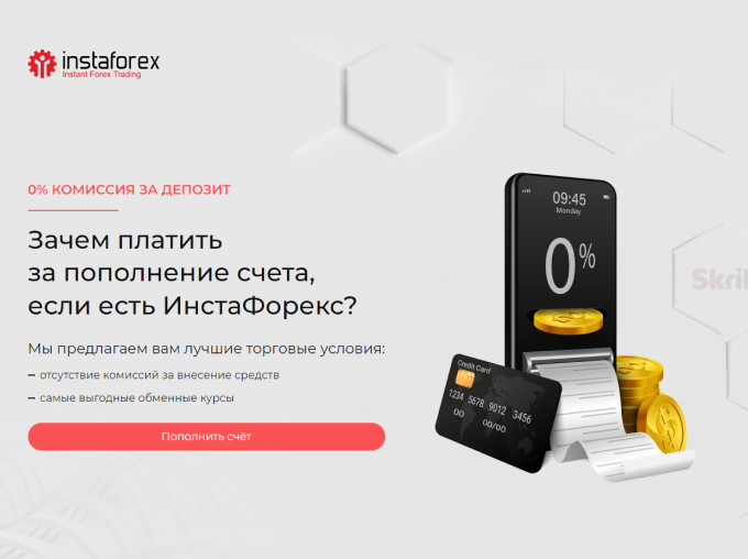В ИнстаФорекс самый выгодный обменный курс и нет комиссий за пополнение. Неважно, какую платежную систему использует клиент – сумма депозита зачисляется на торговый счет всегда в полном объеме, без вычета каких-либо комиссий.