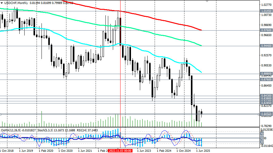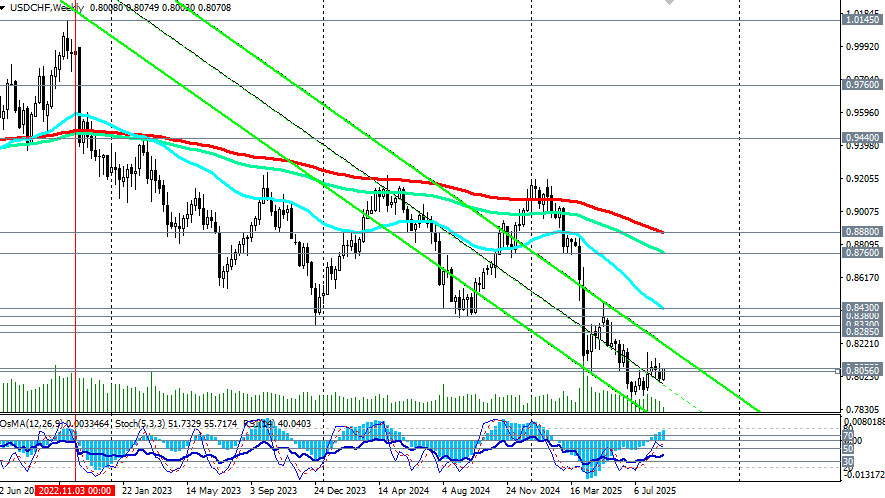 В альтернативном сценарии цена все-таки получит какой-либо сильный позитивный импульс, например, от сильных данных по ВВП США (в четверг) и американских PCE (в пятницу), пробьёт уровень сопротивления 0.8075 и возобновит рост в сторону ключевых уровней сопротивления 0.8285 (ЕМА144 на дневном графике), 0.8380 (ЕМА200 на дневном графике), отделяющих среднесрочный медвежий рынок от бычьего. Дальнейший рост и пробой уровня сопротивления 0.8430 (ЕМА50 на недельном графике) подтвердит возврат USD/CHF в зону среднесрочного бычьего рынка, создав предпосылки для дальнейшего роста в сторону ключевых долгосрочных уровней сопротивления 0.8760 (ЕМА144 на недельном графике), 0.8800, 0.8880 (ЕМА200 на недельном графике).