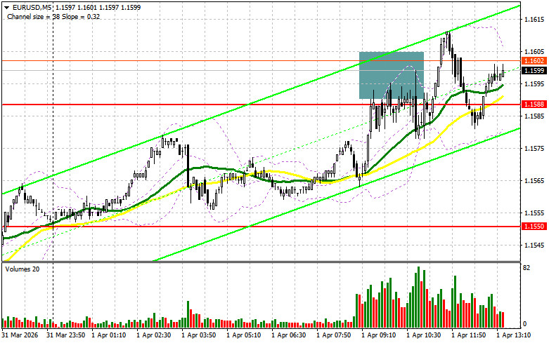 В своем утреннем прогнозе я обращал внимание на уровень 1.1588 и планировал от него принимать решения по входу в рынок. Давайте посмотрим на 5-минутный график и разберемся с тем, что там произошло. Рост и формирование ложного пробоя в районе 1.1588 привели к точке входа на продажу евро, но после снижения на 10 пунктов давление на пару снизилось. На вторую половину дня техническая картина была пересмотрена.Для открытия длинных позиций по EURUSD требуется:Хорошие данные по производственному индексу PMI еврозоны, который оказался выше