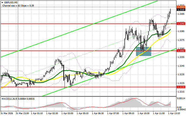 В своем утреннем прогнозе я обращал внимание на уровень 1.3262 и планировал от него принимать решения по входу в рынок. Давайте посмотрим на 5-минутный график и разберемся с тем, что там произошло. Прорыв и обратный тест 1.3262 привели к точке входа на покупку фунта, что вылилось в рост пары в район сопротивления 1.3293. На вторую половине дня техническая картина не пересматривалась.Для открытия длинных позиций по GBP/USD требуется: Небольшая коррекция фунта после слабых данных по индексу PMI для производственного сектора Великобритании