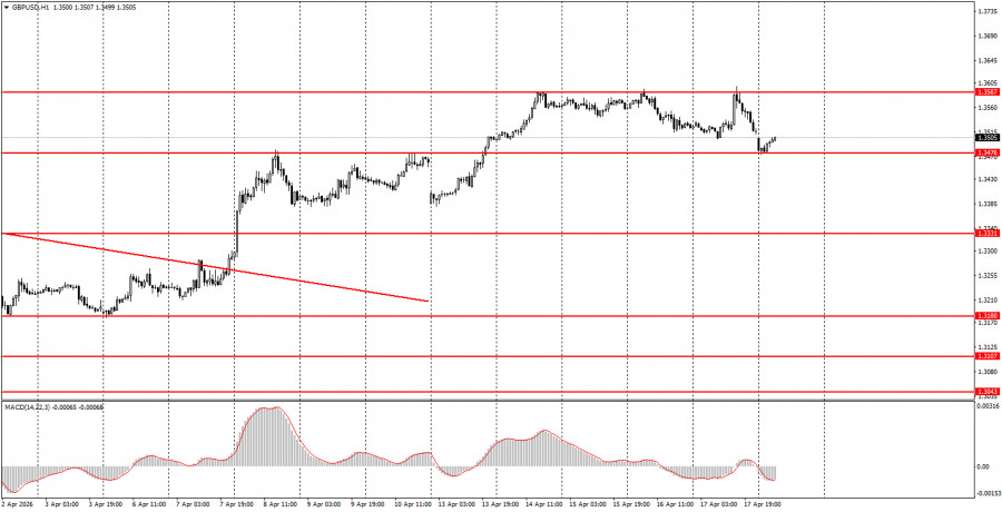 Разбор сделок пятницы: 1Н график пары GBP/USD. Пара GBP/USD в течение пятницы также не сумела продолжить восходящее движение и в третий раз отскочила от нового уровня 1,3587. Напомним, что в пятницу Дональд Трамп сообщил об открытии Ормузского пролива, и это фактически было единственное событие дня. Однако после первичной реакции рынка в виде покупок британского фунта цена развернулась и день завершился на 100 пунктов ниже. Уже на выходных стало известно, что Ормузский пролив остается перекрытым, до соглашения